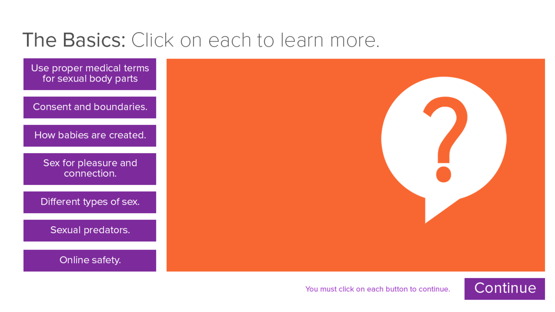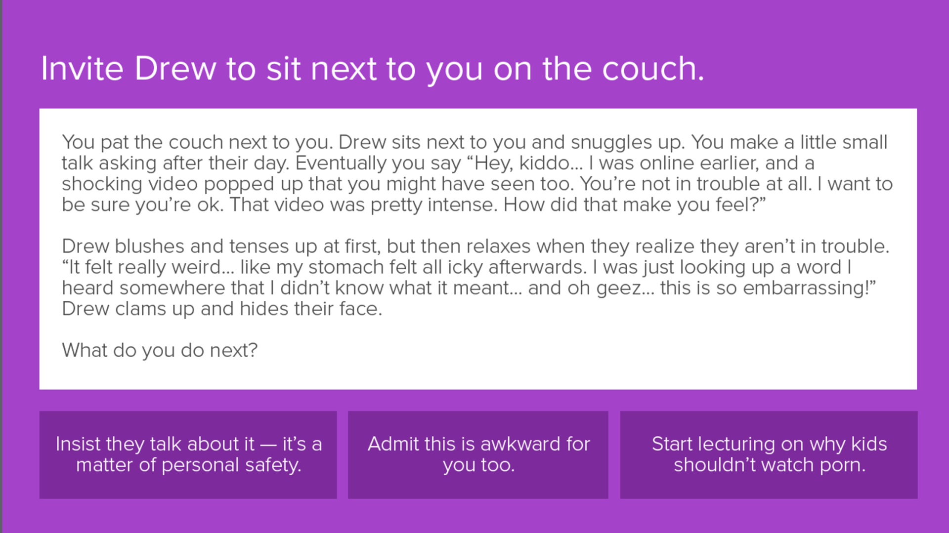 SOLUTION: Create a short online training course using a storytelling approach that allows parents to practice having these difficult conversations in a low-stakes way. By using a branching scenario, parents learn how to have these conversations through the natural consequences of their choices. The course begins by explaining why talking to tweens is the best age range to begin these conversations. Foundational topics that should be discussed with children before these conversations occur are covered, as well as an exercise to dive into any barriers parents may encounter with the subject matter.